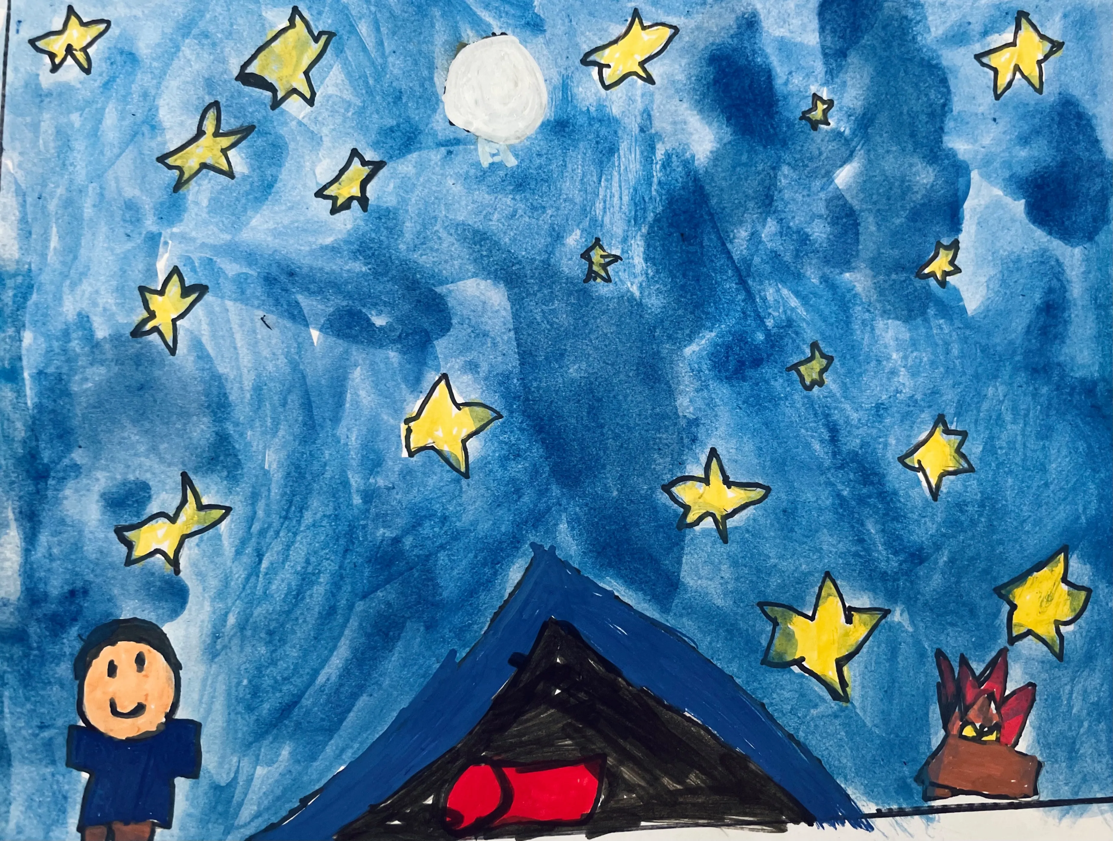 My name is Connor. I really like the night sky, because it's really pretty and there's a lot of possibility. I chose to paint this, because it makes me think of the night sky, even when I'm not outside. It makes me feel happy, but sometimes when I look at it I feel like I'm not very good at painting. Even though I sometimes feel like it's not good enough, I'm still glad I painted it.
