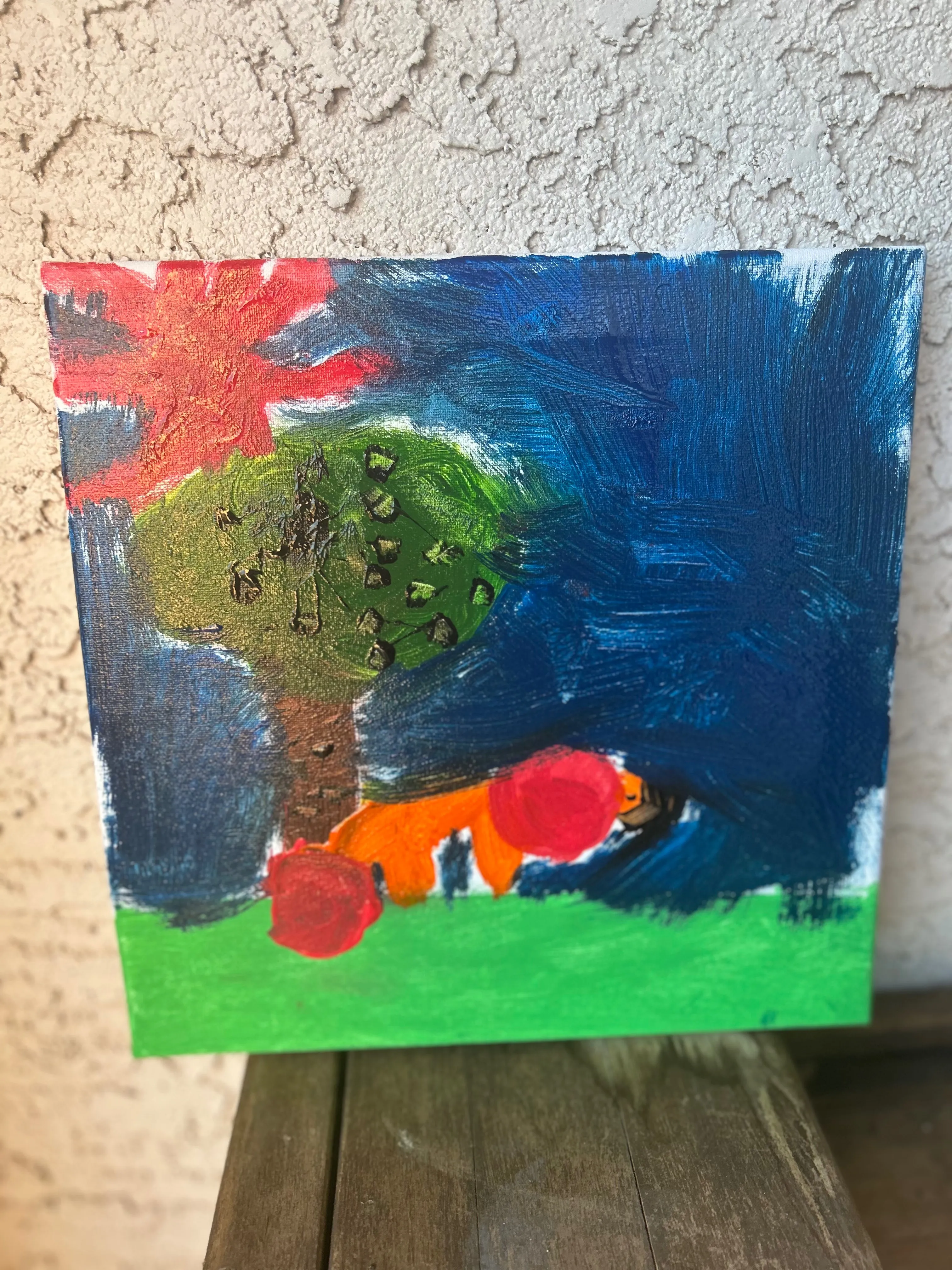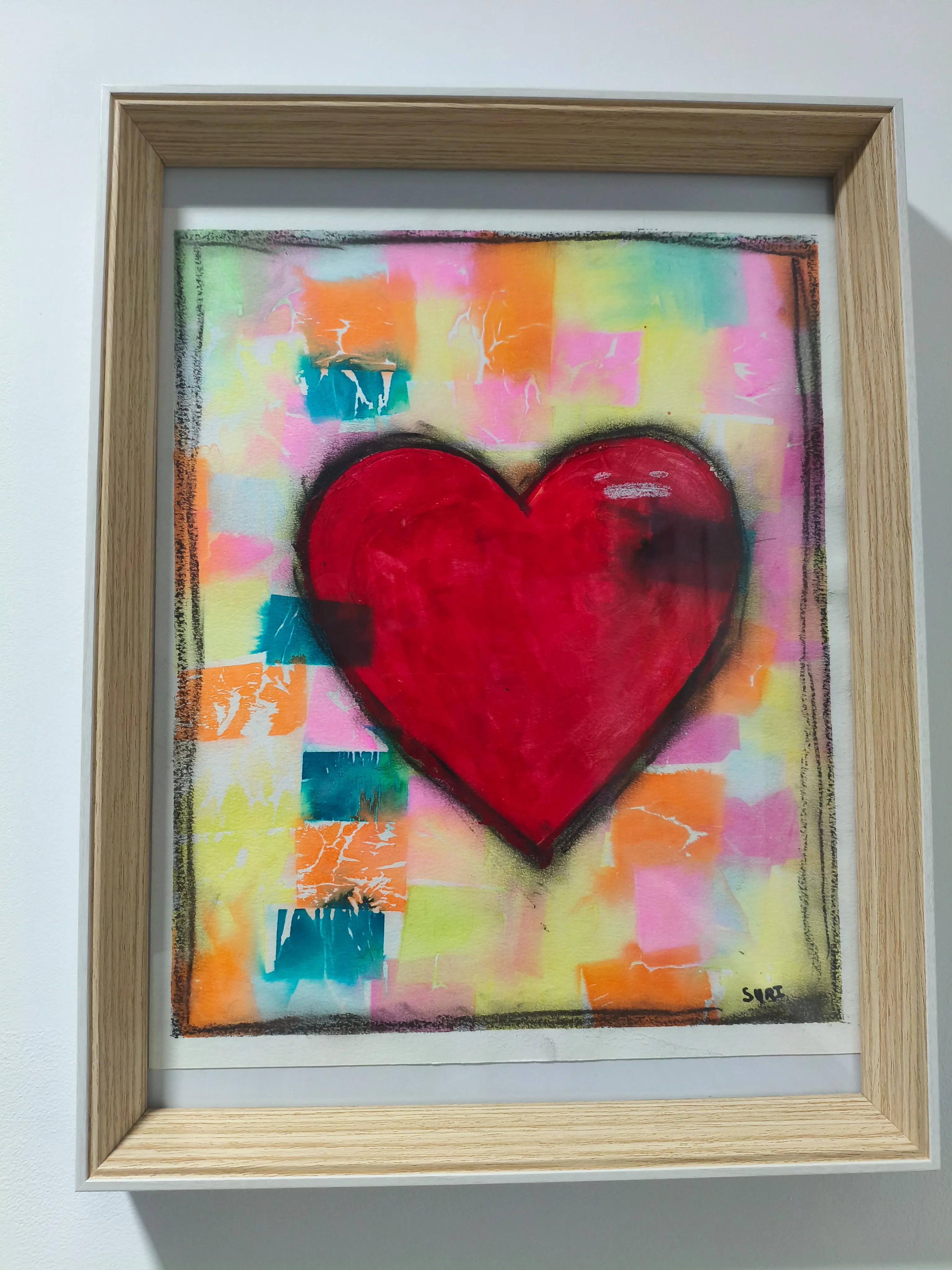 I am six years old and I love to create through drawing, painting and model making. I was inspired by Jim Dine to create this painting for my mother using mixed media like tissue paper, crayon and paints. The painting makes me feel happy as it uses the colors I love and the heart is full of love.