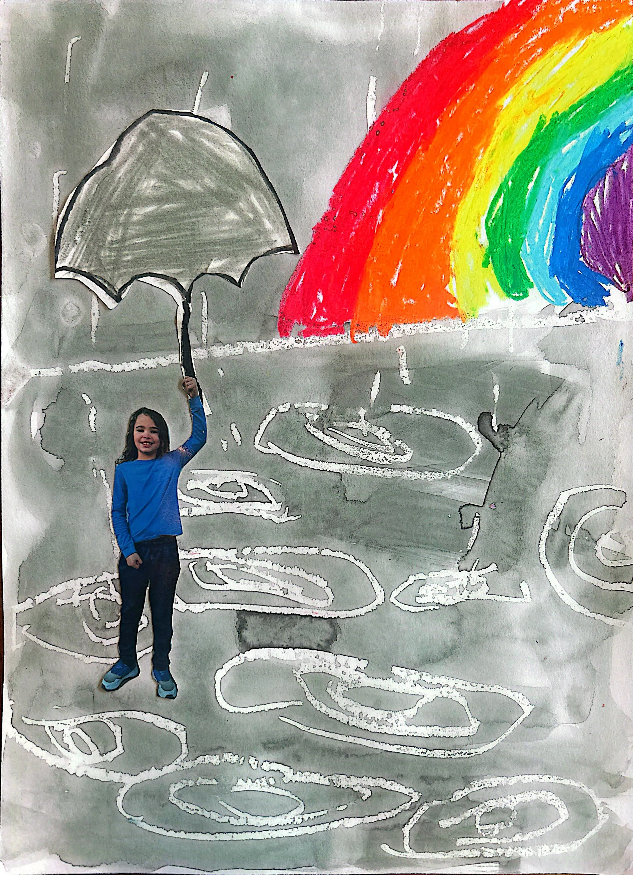 My name is Aslan. I am 8 years old and I do an art class. This is one of my favorite projects from class and I wanted to put it in the contest. I used watercolor, oil pastels, and a picture of myself to create this piece. I feel happy when I look at this art and I hope you will, too!