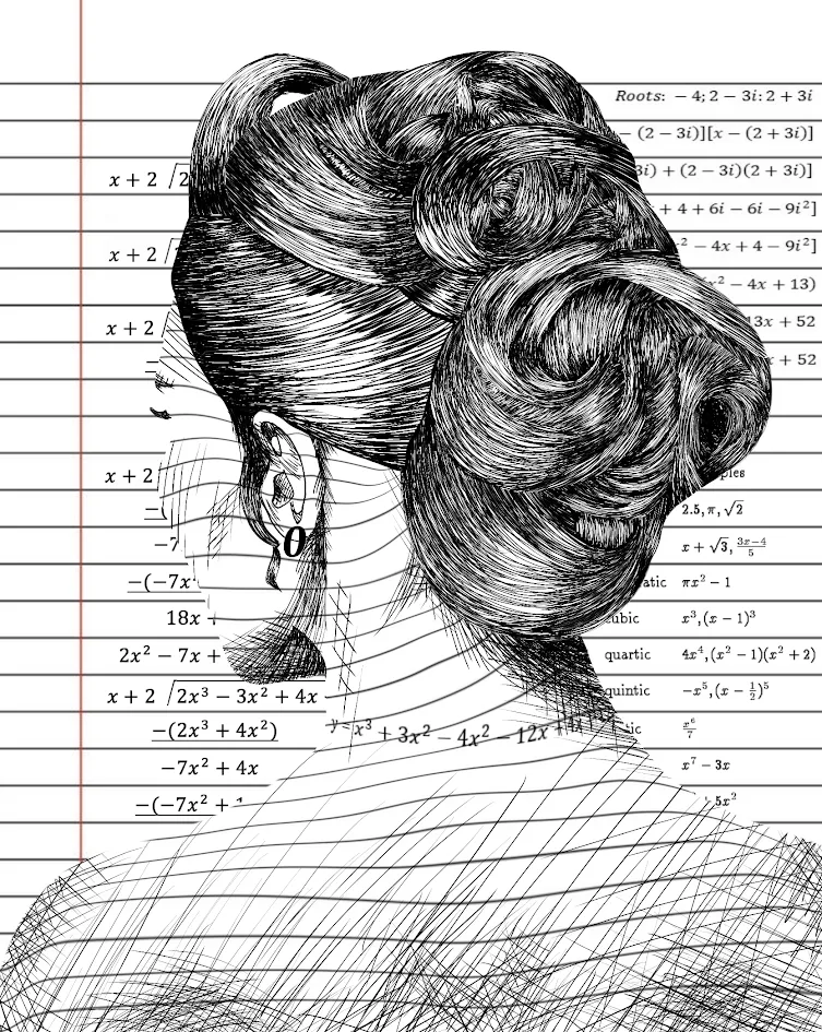 Hello, I like doing art with no thought behind it. The piece was based on a pretty reference I found(I liked the hair) and I just wanted to draw it via scribbles. I have no idea how she turned into paper. It was not the intent, as there was no intent. I also don't know where the polynomials came from. They just appeared. I was having fun hatching and that's all there is to it :D