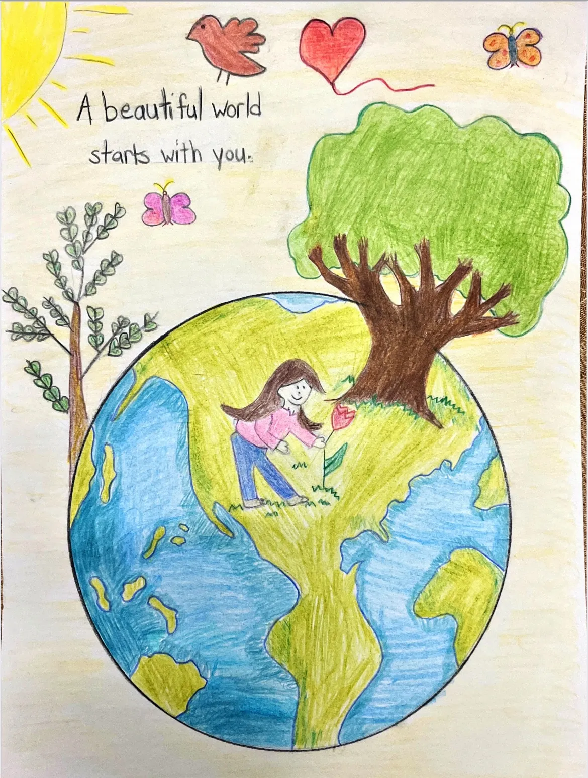 Hi, I'm Lianna and I like to dance, play with my friends, go to the beach and I love to draw. My drawing is called "A beautiful world starts with you" because each person has the power and responsibility to make the world a better place. The big green tree symbolizes growth, strength, and a healthy environment. The sun, birds, butterflies, heart, and flowers all represent life, love, peace, and harmony in nature. The heart especially shows that we should care for the Earth with love.