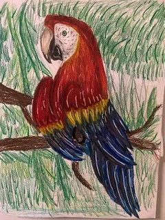 This beautiful Scarlet Macaw is listening to the sound of nature and wondering if she should stay or fly away into the canopy of the Amazon. I am inspired by nature. I am 13 years old. Art brings me peace, so when I draw the nature around me, I feel we are one.