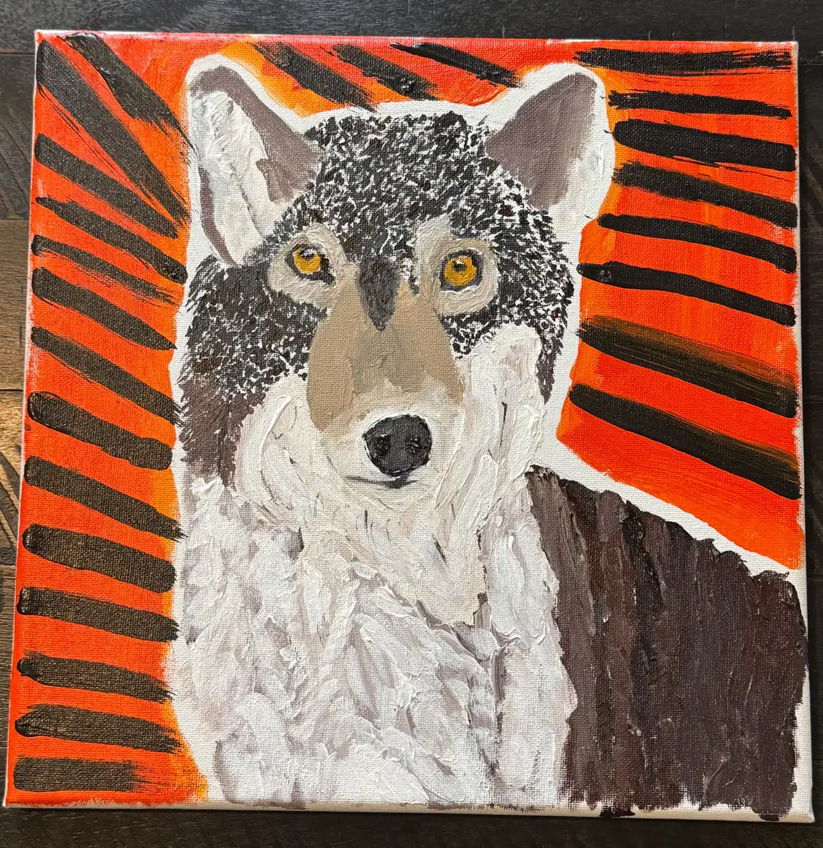 Hi my is Winter. I wanted to draw this because I really love wolves. I love all types of canines but the wolf is my favorite wild animal. I like how wolves have one leader of the group which is the Alpha. They are the protectors of the pack and help guide them to keep them safe. Painting this makes me feel like I want to paint some more. I love looking at this painting and staring into the wolves eyes. This painting is now hanging in my art room so it can be seen everyday.