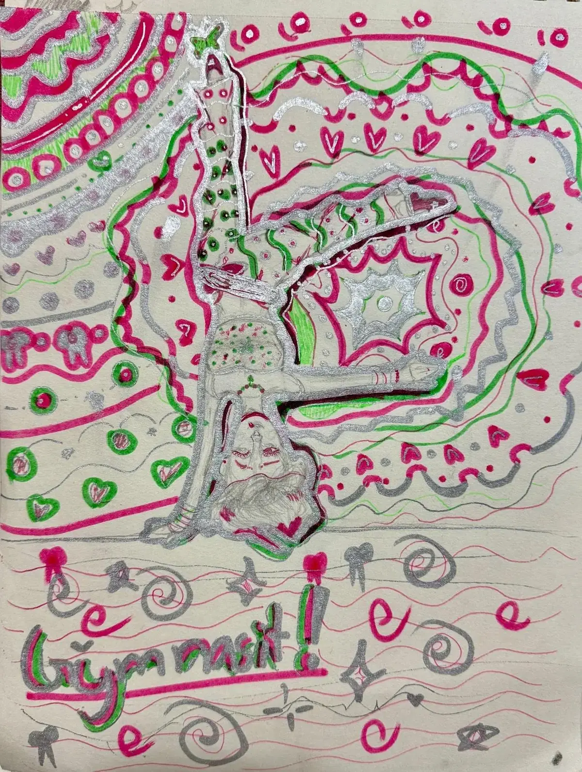 Hi! I love drawing I started when my older cousin inspired me too draw. What inspired to make this art work is because of flexibility, I can do a hand stand so I thought why can't my paper! After I was finished and I read through the artwork page thing and I saw it said to be creative undecided to go for it! I added a lot of neon and shiny colors to make it pop I really enjoyed making the art work and I hope you did too :)