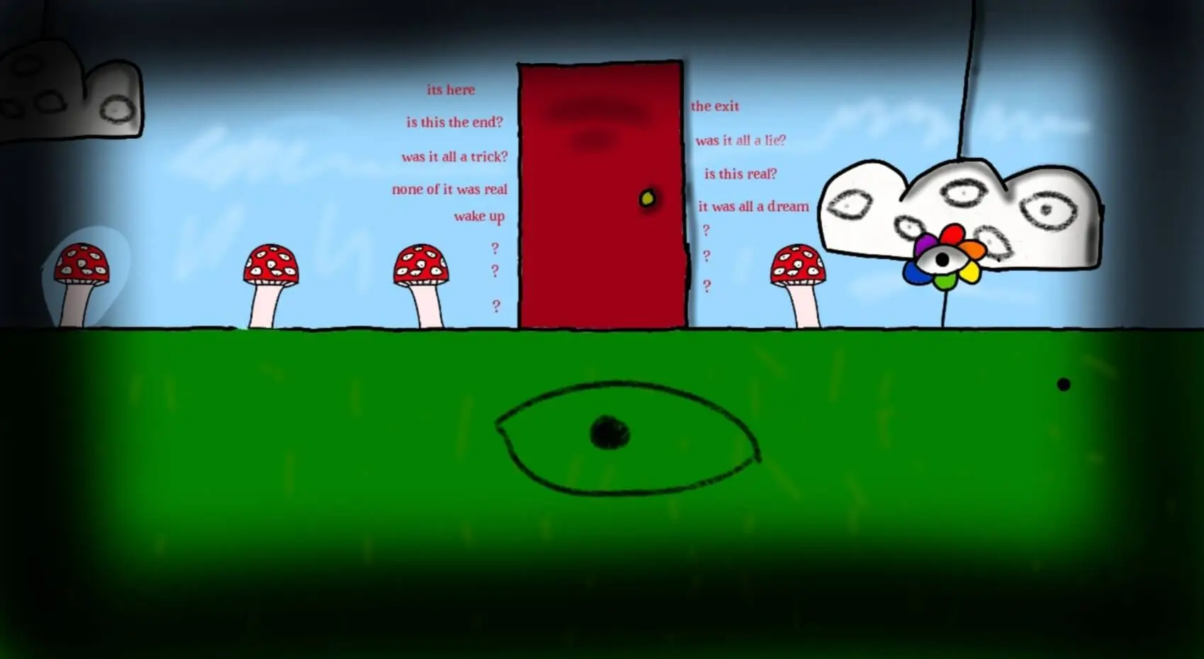 This piece was inspired by a dream I had where I was walking through a garden of mushrooms with eyes and the sky was clear blue, so I decided to make a piece of my dream from memory so I can remember that dream over and over again. It reminds me of the days where I always loved to play with plants and flowers in my back yard. That activity always made me happy.