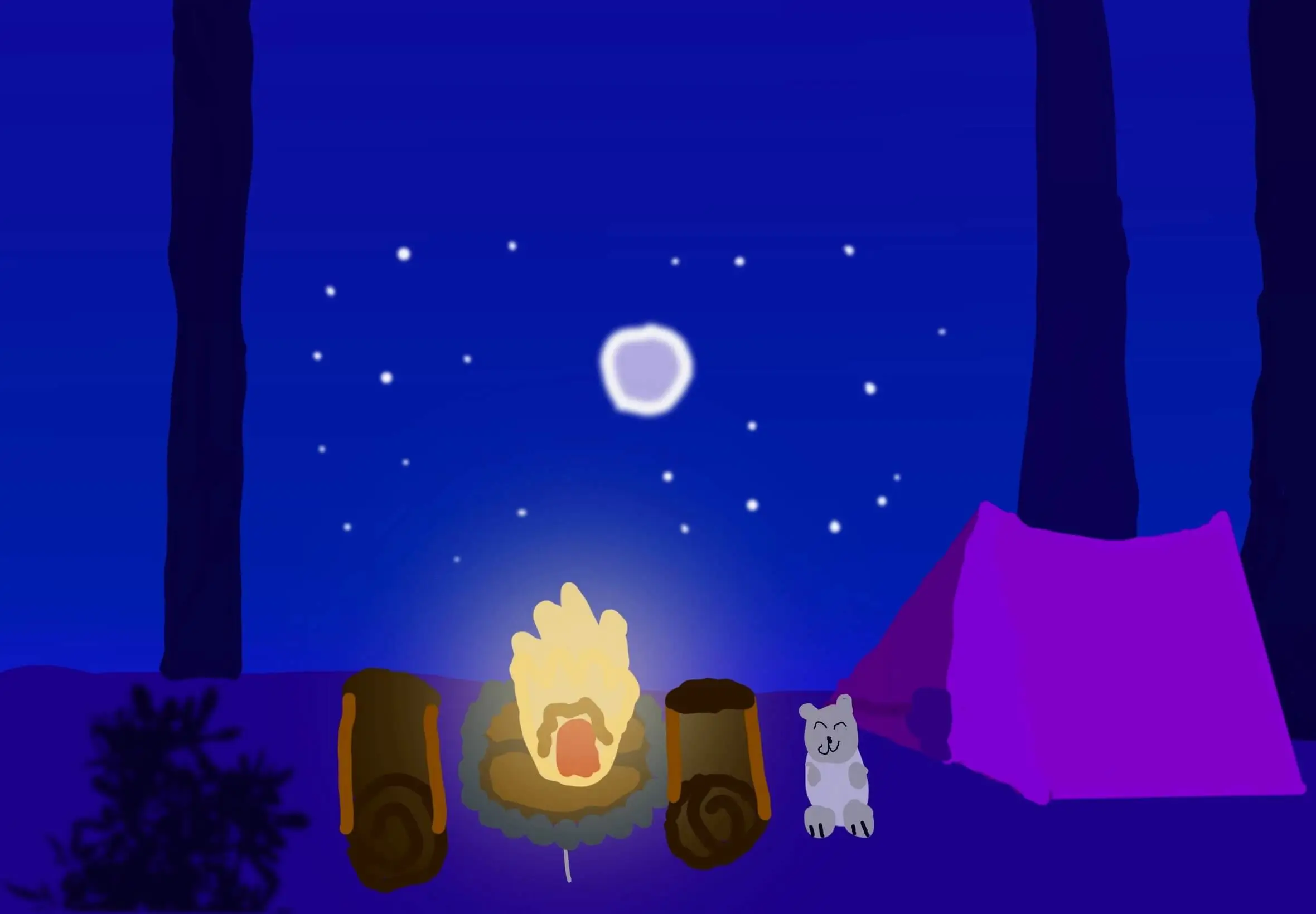 I was inspired to draw this piece because I love the stars and I have always wanted to go on a camping trip. I think the stars are like little tiny campfires because they're always sparkly and they always sparkle up the night... even when the moon isn't out! I like art, when you feel confident in yourself, your art lights up your heart. When you listen to yourself, your art shines like the stars no matter who you are- you are unique,and have a gift. I hope you liked this message.:)