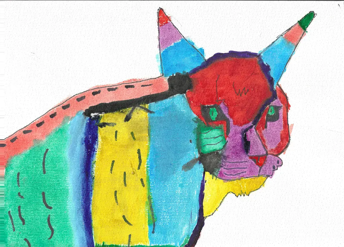 I was inspired to draw this colorful abstract cat because I am obsessed with cats. the colors in the back are like me because i am hyper and colorful. I am not here to win just to show my art and If I do that would be nice so I can buy some books and do more clubs. I hope you enjoy looking at my art.