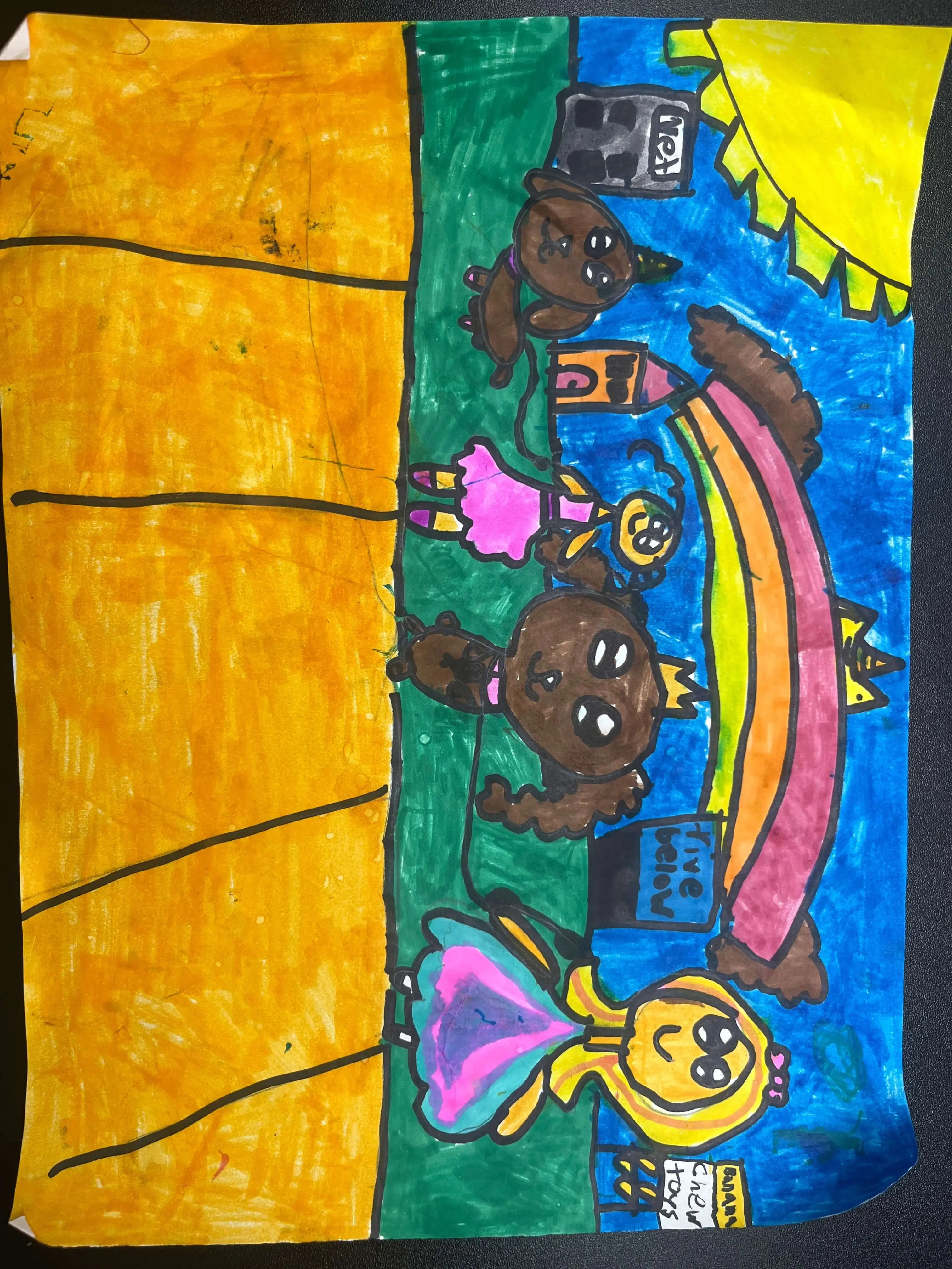 What inspires me to make this is The animal grooming truck I saw outside my house. my favorite part was the puppies. The smaller parts represent that they are far away the and the bigger ones represent. They are closer in the picture. my other favorite part was the rainbow with the crown, unicorn horn and puppy ears.