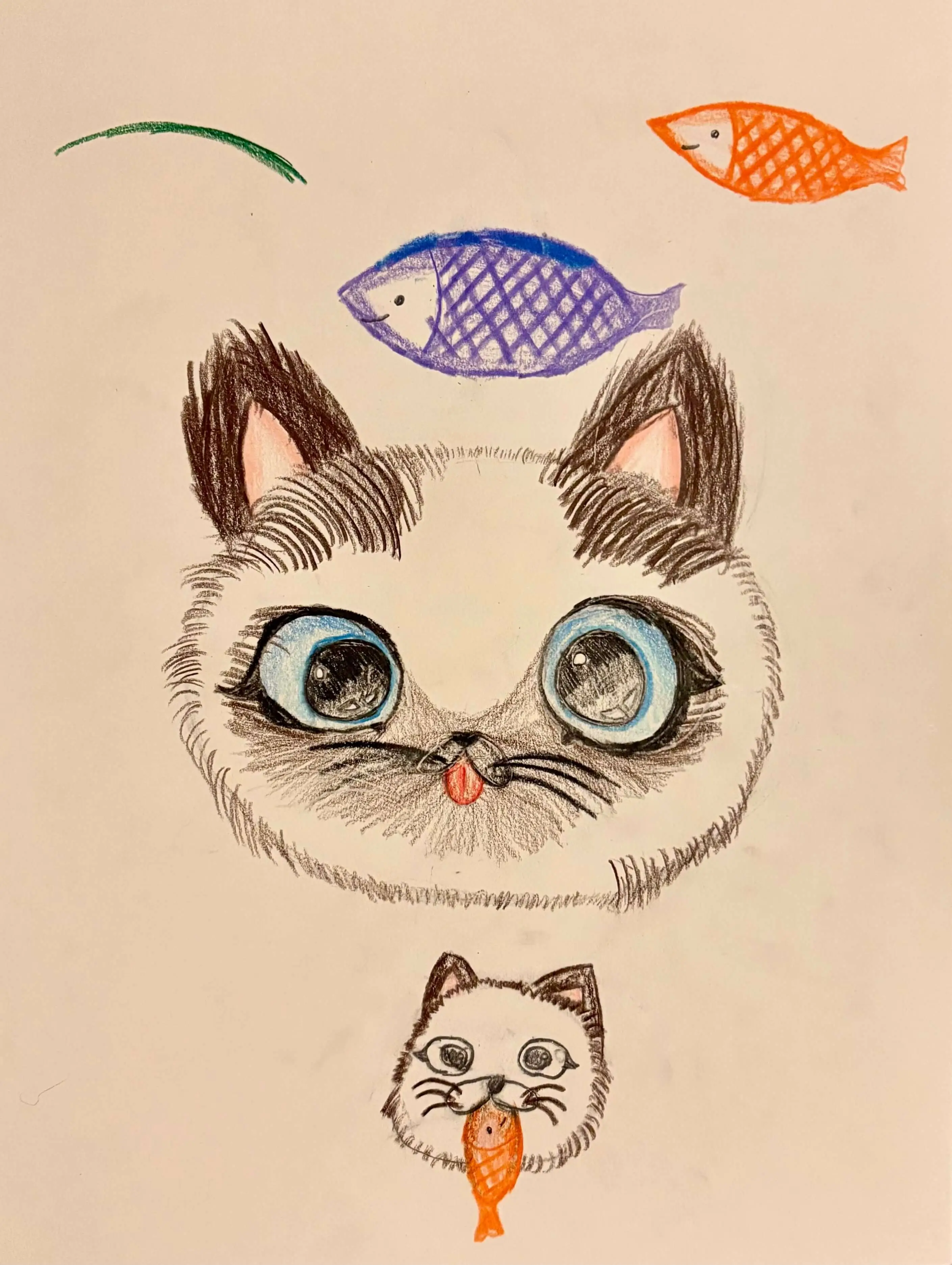 I love all the colors of the rainbow and take every opportunity to use lots of them. Originally, I wanted to create a different picture using acrylic on canvas, but it did not turn out the way I dreamed of. After a bit of trial and error, patience, and determination, I created A Fish Out of Water with liquid paint, straws and brushes. Creating this picture taught me not to give up on an idea and not to be afraid of adjusting my plans. This painting makes me feel happy and proud.