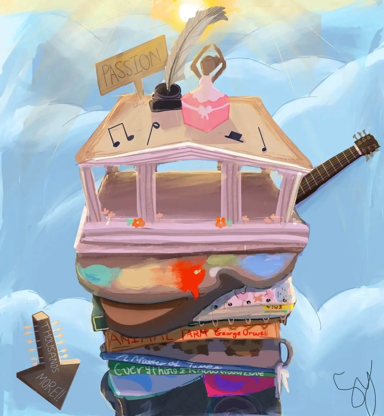My name is Sylvie, I am a digital/traditional artist that is learning about realism and showing my art to the world. I wanted to make this piece because I think to sum up your life and passion, you could just stack all the activites in the world between two buns and take out the different ingredients (passions) to find the perfect sandwich to eat for the rest of your life. This art piece makes me feel like even if you feel like you don't have a passion, there will always be one out there to try.