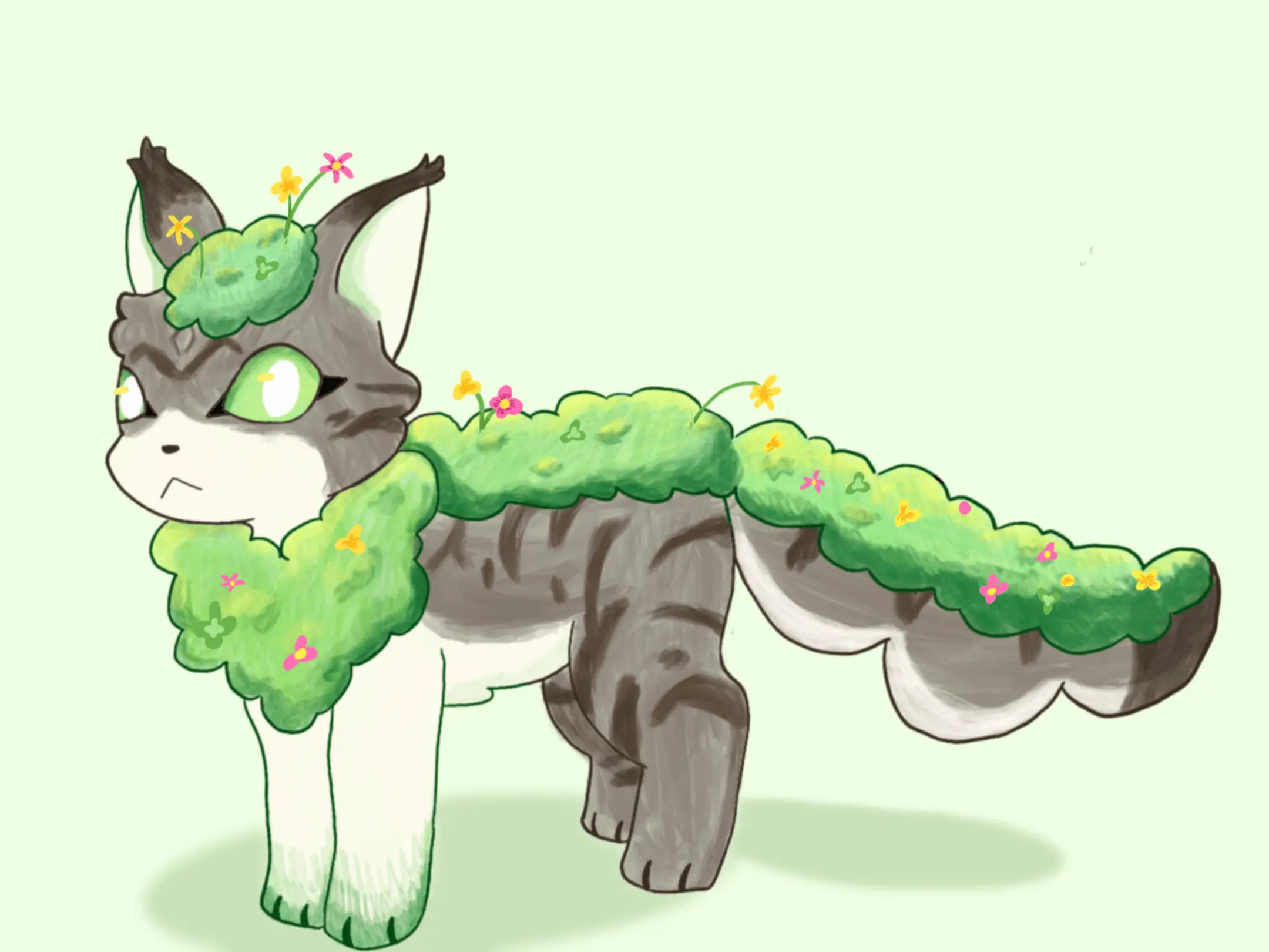 Hello! I am Arianna and I love art, video games, cartoons, and books. Pokémon was a big inspiration for my art style because my friends almost always ask me to draw their favorite little critters from the franchise for their birthdays. One day I randomly had the idea to turn my cat into a Pokémon. Thus, Mossious the grass and rock type was born.