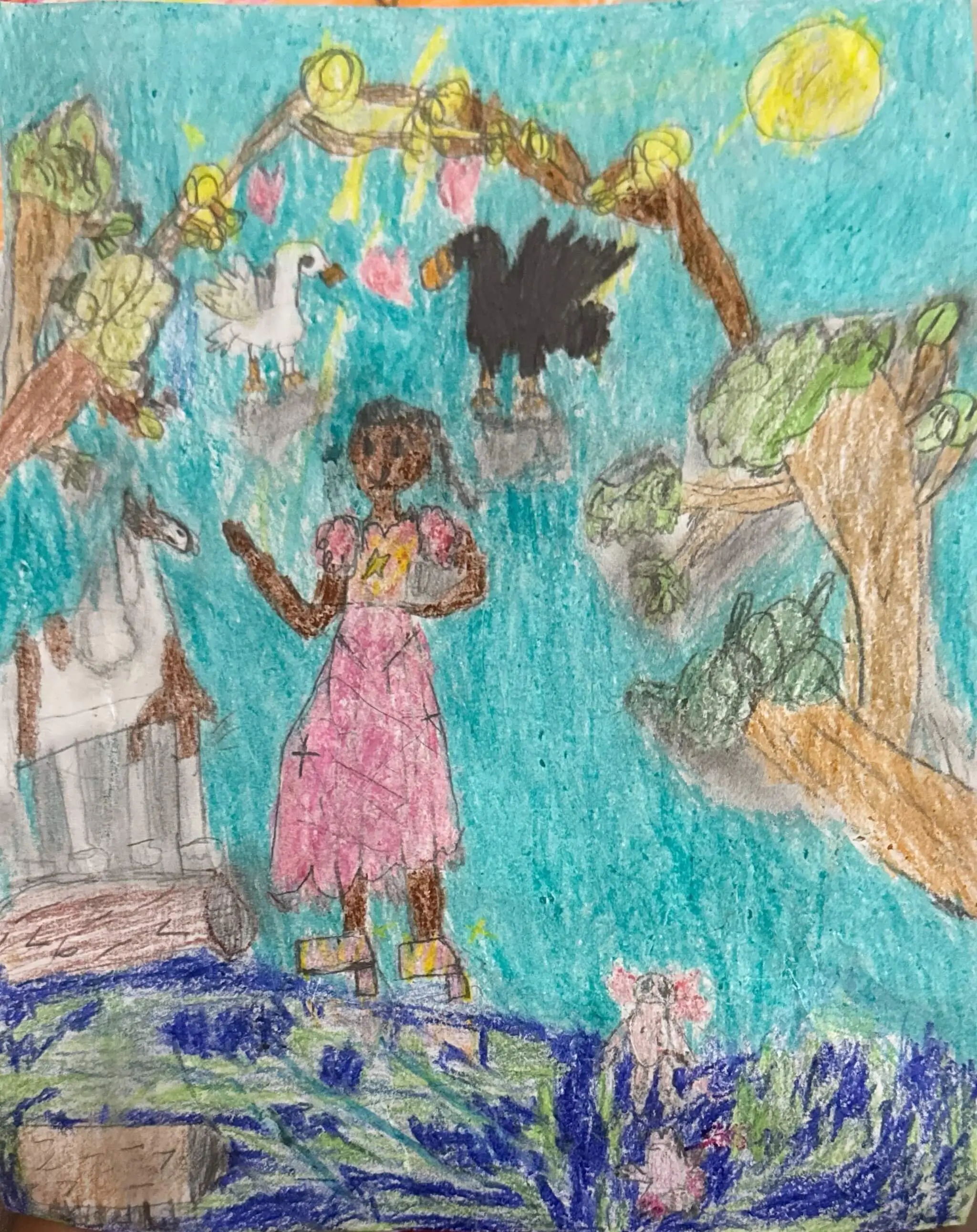 My name is Kinley and I am 14 years old. I have always loved drawing but especially now because I have been taking out school classes with professor Sanya for the last year and I have improved SO much. I love her drawing classes and look forward to them every week. This piece made me feel really happy because it reminds me of the beauty of nature.